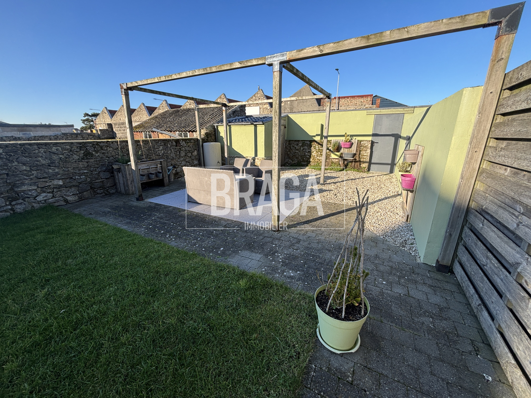 A l'extérieur, un jardin de 150m² et 2 terrasses aménagées et équipées, avec chalets de jardin ainsi que le soleil toute l'après-midi.