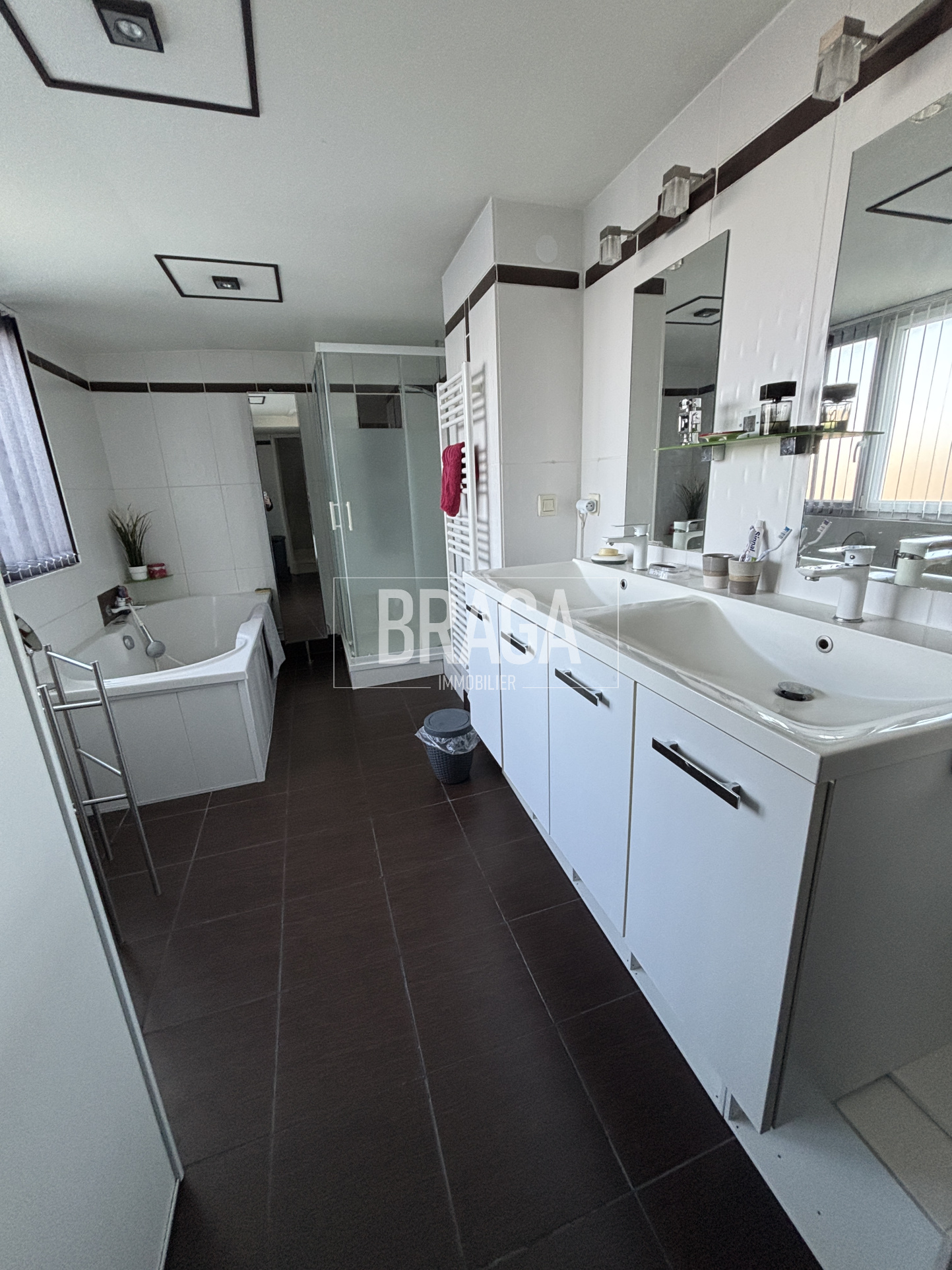 Au premier étage, grande salle de bains, avec douche, baignoire, double vasques et W.C, deux grandes chambres avec rangements intégrés sur mesure.
